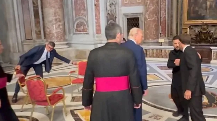 《消息报》称,从杜邦-艾尼昂转发的视频可以看到,在葬礼开始前夕,马克龙与美国总统特朗普、乌克兰总统泽连斯基会面,会面大厅的现场最初摆放了三把座椅,但随后画面显示特朗普与泽连斯基进行“一对一”单独会谈,马克龙的椅子并不在旁边。